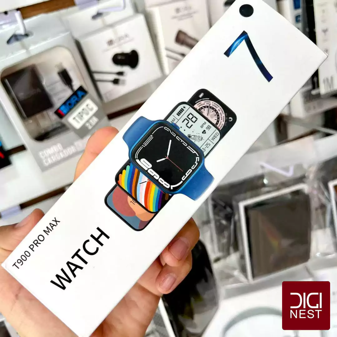 ساعت هوشمند T900 Pro Max سری 7، دارای طراحی مدرن و ظریفی است که از اپل واچ سری 7 الهام گرفته و به شکل مستطیل با صفحه 2.5 بعدی در طرفین که با گوشه‌های منحنی طراحی شده است و دارای یک دکمه قابل چرخش می‌باشد که برای چرخاندن صفحه و بزرگنمایی کار می‌کند همچنین دکمه دیگری برای روشن یا خاموش کردن یا تغییر سبک‌های منو وجود دارد. درست در زیر این دکمه، میکروفون و در سمت چپ خروجی اسپیکر نمایان می‌باشد.
